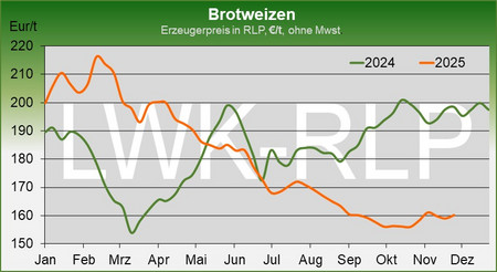 Der Handel am regionalen Getreidemarkt verläuft in ruhigen Bahnen, die Abgabebereitschaft in der Landwirtschaft ist nach dem Liquiditätsbedarf für Pachten und Betriebsmittelkäufe wieder rückläufig. An den Landlägern stehen die Jahresenddispositionen an, kontrahierte Ware fließt nur stockend in die Industrie ab.