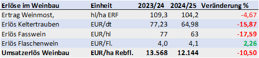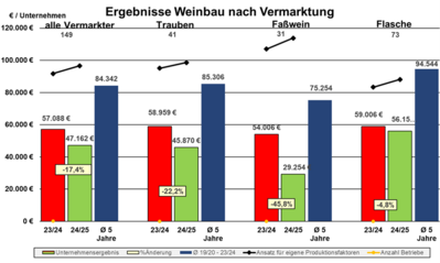 Die Weinbaubetriebe mussten nun schon im 3. Jahr in Folge einen deutlichen Rückgang der Ergebnisse hinnehmen. Neben schwächeren Naturalerträgen waren es vor allem die Erlöse für Fasswein und Keltertrauben, die den Rückgang der Umsatzerlöse bestimmten. Beim Flaschenwein waren die Erlöse je Einheit leicht positiv – im Rahmen der Inflation.