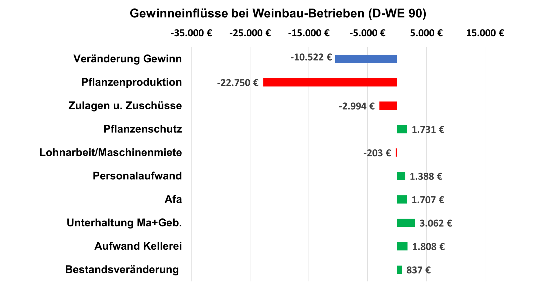 Bei der Betrachtung der Einflussfaktoren fällt zunächst auf, dass der Rückgang der Umsätze stärker war als Rückgang der Ergebnisse. Hierfür zeichneten sich eine Reihe an Einsparungen verantwortlich, von denen keine für sich groß heraussticht. Eingespart wurde an der Unterhaltung von Maschinen und Gebäuden, auch der Pflanzenschutz war günstiger zu erledigen. Einsparungen an der AfA weisen darauf hin, dass weiterhin und verstärkt Ersatz- und Neuanschaffungen zurückgestellt wurden, ein geringerer Aufwand in der Kellerei spricht für eine Reduzierung der Füllmengen.