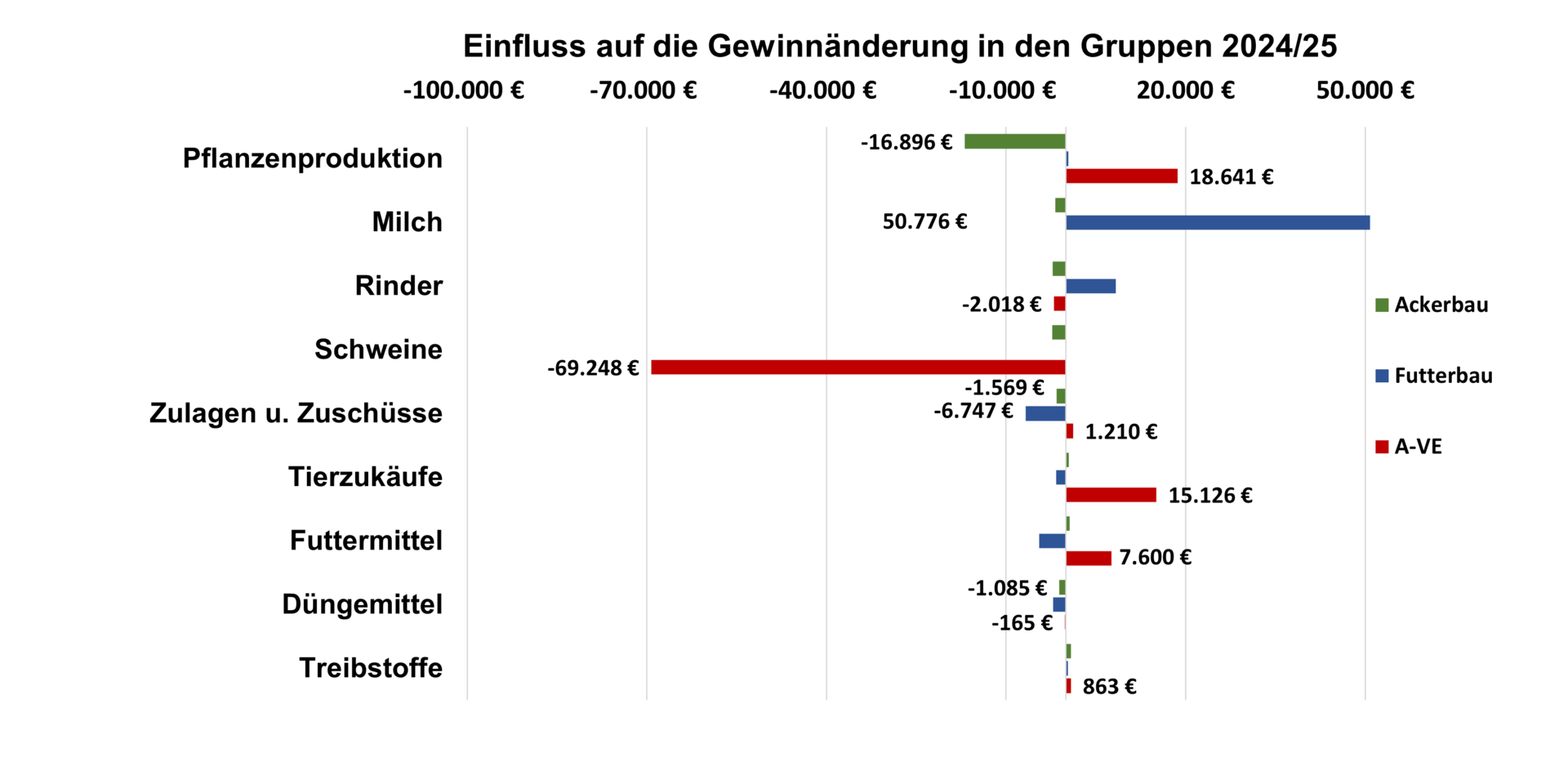 Bei den Futterbaubetrieb führten die Mehreinnahmen aus der Milch zu deutlichen Ertragszuwächsen. Die Zuwächse aus Tierverkäufen „Rind“ fallen dagegen bescheidener aus, als es die Preisveränderung von + 23 % erwarten ließe. Ursächlich war, dass – vermutlich in Folge der Blauzungenkrankheit – etwa 11 % weniger Tiere verkauft werden konnten. Da es sich hier um eine Buchführungsauswertung handelt, mischen sich stets Mengen- mit Preiseffekte.