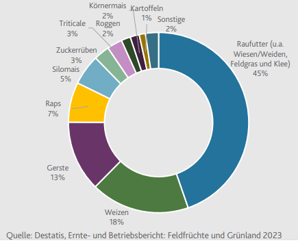Die Gesamtnutzfläche für Feldfrüchte und Grünland betrug 2023 rund 589.800 ha, davon entfielen 45 % auf Raufutter (Grünland, Feldfutteranbau). Bei den Feldfrüchten dominiert Weizen mit 18 %, gefolgt von Gerste (13 %), Raps (7 %), Silomais (5 %) und Zuckerrüben (3 %). Weitere Kulturen wie Triticale, Roggen, Körnermais und Kartoffeln tragen zur Diversität bei.