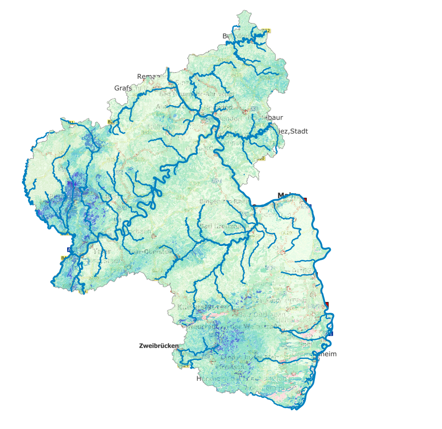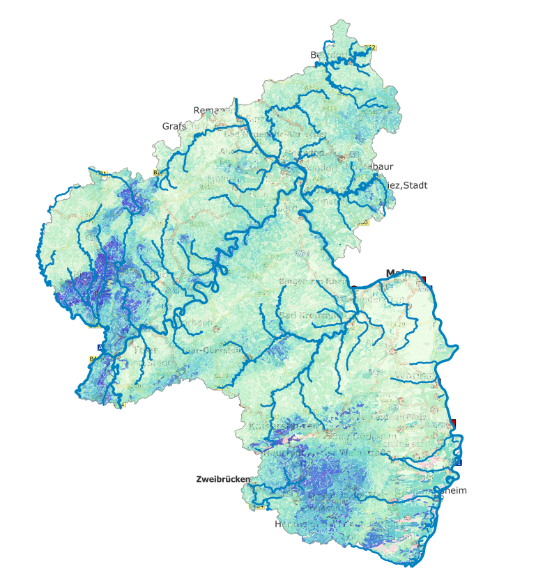 - Dunkelblaue Bereiche (>250 mm): Hohe Neubildung in den niederschlagsreichen Mittelgebirgen (Eifel, Hunsrück, Westerwald) und in Tal- und Auenlagen