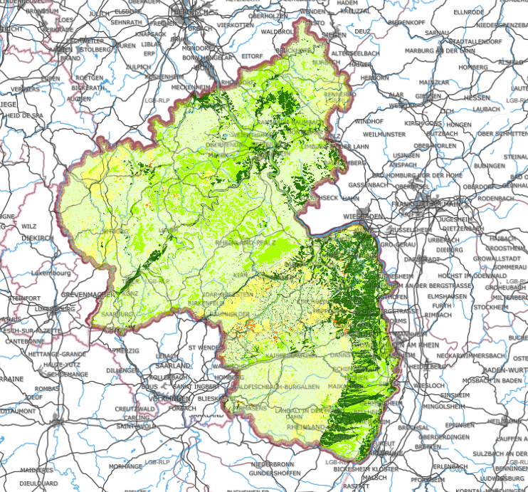 - Gelbe Bereiche mit mittlerer nFK liegen vor allem in den Übergangsregionen vom Rheinhessischen Lössgebiet zu den Mittelgebirgen - aber auch einige Flächen im südlichen Teil (westlich der Vorderpfalz) sind betroffen.