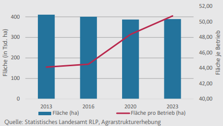 - Die durchschnittliche Betriebsgröße ist dagegen gestiegen – von rund 44 ha (2013–2016) auf über 50 ha im Jahr 2023.