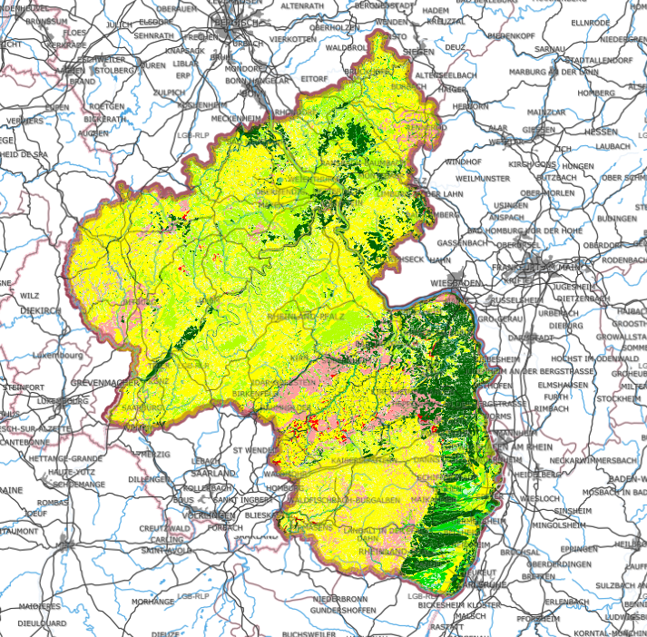 - Rote Bereiche mit geringem Potenzial: dominierend in Höhenlagen von Eifel, Hunsrück und Westerwald – kühle Temperaturen und steinige/flachgründige Böden begrenzen die Kulturwahl