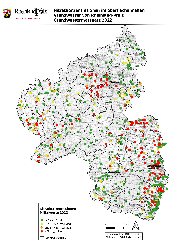 Nitratbelastungen im Grundwasser sind in Rheinland-Pfalz vor allem in Regionen mit intensiver landwirtschaftlicher Nutzung ein Thema. Besonders in Gebieten mit sandigen Böden und geringer Grundwasserneubildung – wie in der Vorderpfalz – wurden an einzelnen Messstellen Nitratwerte von über 150 mg/l erhoben. Die EU-Nitratrichtlinie (91/676/EWG) verpflichtet alle Mitgliedstaaten, solche Belastungen zu reduzieren, um den Schutz der Gewässer sicherzustellen.