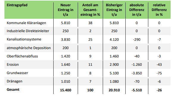 Im Vergleich zu früheren Berechnungen sind die aktuellen Gesamteinträge deutlich niedriger: Die neue Modellierung reduziert die Werte um etwa 26 %. Besonders auffällig ist der Rückgang bei den Pfaden Erosion (-43 %) und Grundwasser (-75 %). Während frühere Modelle den Grundwasserpfad mit einem Anteil von 24 % bewerteten, liegt dieser nun nur noch bei rund 8 %. Grund hierfür ist die Nutzung aktueller Messwerte und die Berücksichtigung der tatsächlichen Transportprozesse, insbesondere der Orthophosphat-Konzentrationen im Grundwasser. Diese Anpassungen führen zu einer realistischeren Einschätzung der grundwasserbedingten Einträge.