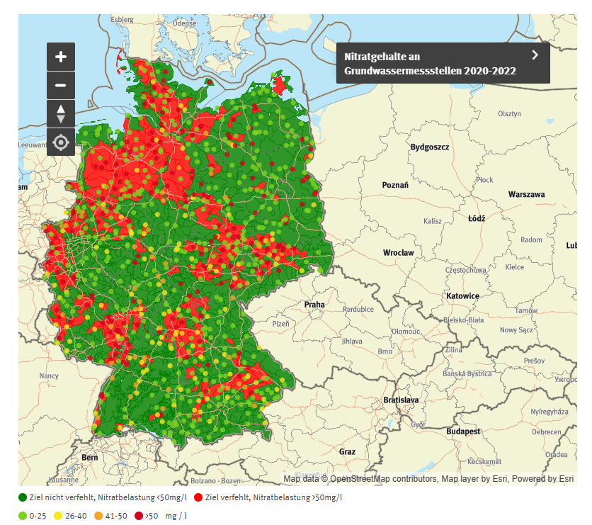 Trotz zahlreicher Maßnahmen wird dieser Grenzwert in vielen Regionen seit Jahren überschritten. Nach aktuellen Auswertungen erreichen mehr als ein Viertel der Grundwasserkörper in Deutschland die geforderten Qualitätsziele nicht. Das bedeutet: In großen Teilen des Landes ist das Grundwasser weiterhin erheblich mit Nitrat belastet.