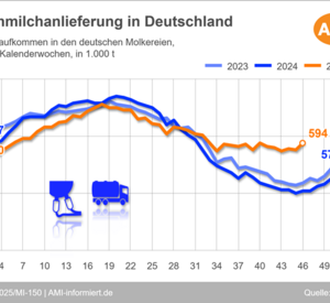 WeiterlesenMitte November stieg die bundesweite Milchanlieferung erneut an und lag deutlich über dem Vorjahresniveau. In der 46. Kalenderwoche wurden 0,9 % mehr Milch als in der Vorwoche geliefert, was einem Plus von 7,5 % gegenüber dem Vorjahr entspricht.
