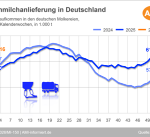 Das Milchaufkommen in Deutschland zeigte sich zu Jahresbeginn weiter leicht steigend. In der zweiten Kalenderwoche lag die bundesweite Milchanlieferung nach Angaben der Zentralen Milchmarkt Berichterstattung (ZMB) um 0,2 Prozent über dem Niveau der Vorwoche und gleichzeitig 5,6 Prozent über dem Vorjahreswert.