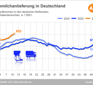 Das Milchaufkommen hat sich Anfang Februar weiter erhöht und folgt damit dem üblichen saisonalen Aufwärtstrend. In Deutschland stieg die Milchanlieferung in der 6. Kalenderwoche um 0,3 % gegenüber der Vorwoche, lag jedoch immer noch deutlich 5,6 % über dem Vorjahreswert.