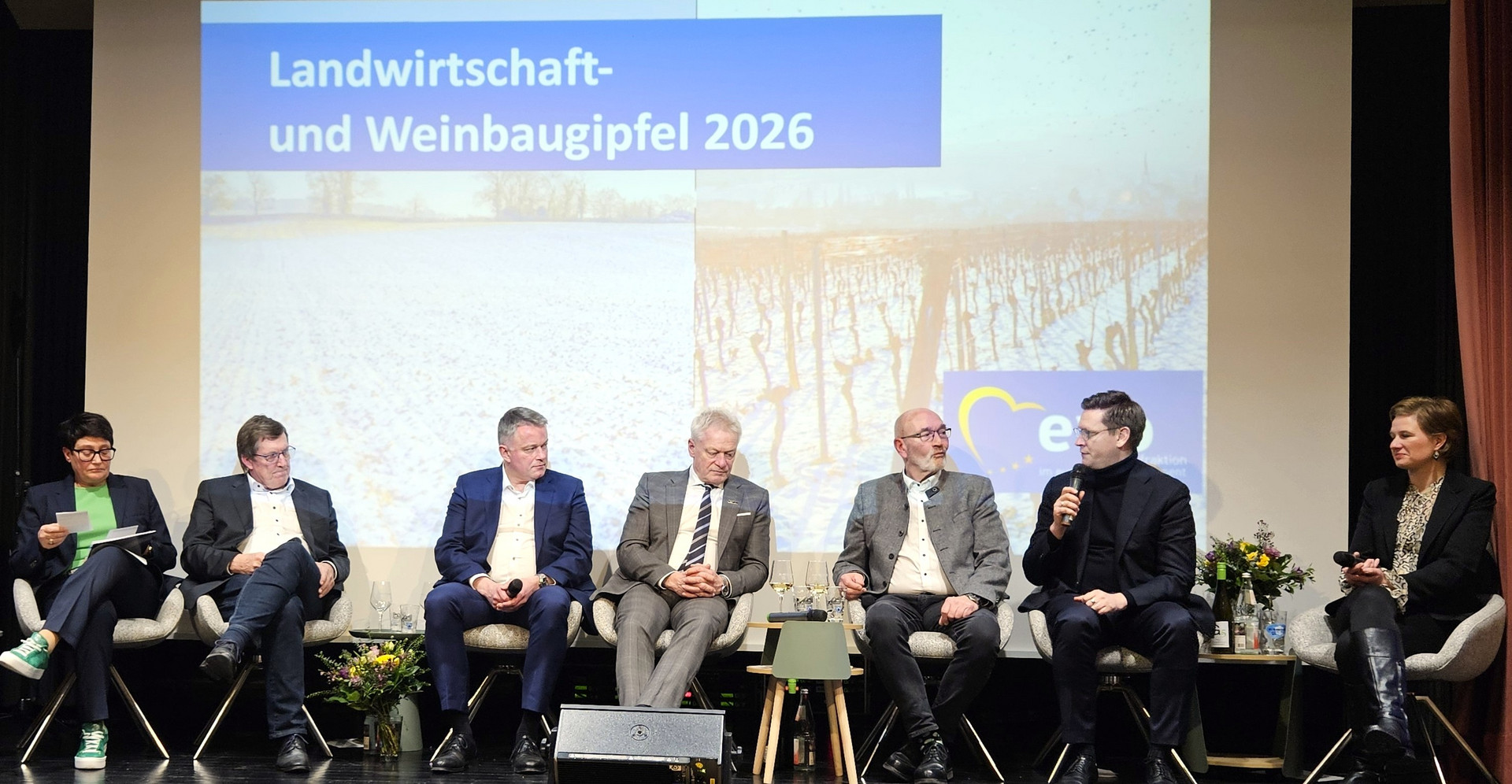 Weitere Podiumsteilnehmende waren neben der Gastgeberin und Moderatorin Christine Schneider der CDU-Spitzenkandidat für die Landtagswahl Gordon Schnieder, Bundeslandwirtschaftsminister Alois Rainer, der Deutsche Weinbaupräsident Klaus Schneider, Bundestagsabgeordneter Johannes Steiniger und DWI-Geschäftsführerin Melanie Broyé-Engelkes.