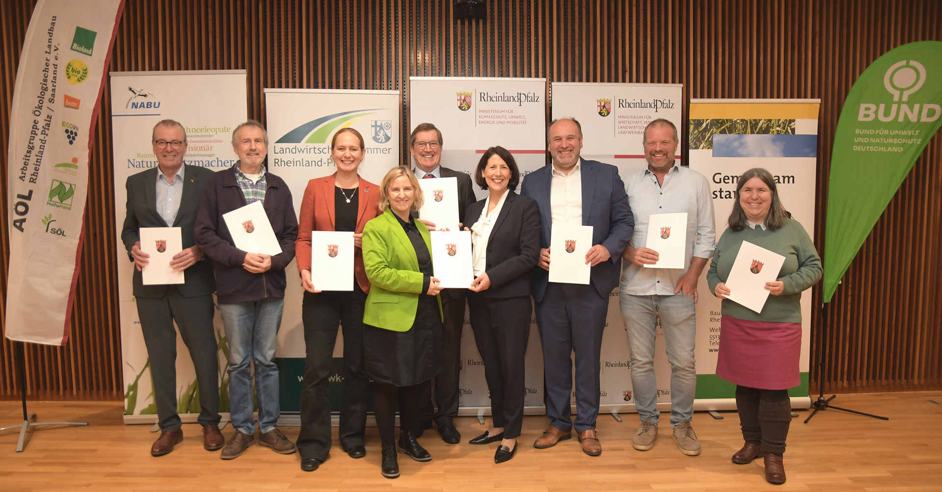 Zusammen mit den beiden Ministerinnen Daniela Schmitt und Katrin Eder haben die Präsidenten und Vorsitzenden der beteiligten Verbände aus Landwirtschaft und Naturschutz am 3. Dezember einen Kooperationsvertrag unterzeichnet. Ziel ist es, die Zusammenarbeit und Kooperation zwischen Landwirtschaft und Naturschutz auf eine neue Basis zu stellen. Es ist das Ergebnis eines seit 2021 laufenden Prozesses, in dem die Landwirtschaftskammer, die beiden Bauern- und Winzerverbände, die Arbeitsgemeinschaft ökologischer Landbau und die Verbände des Naturschutzes NABU und BUND gemeinsame Ziele und Maßnahmen formuliert haben. Alle beteiligten Akteure wollen die Leistungen für die Biodiversität und den Artenschutz stärken und die landwirtschaftlichen Betriebe mit angemessener Honorierung absichern.